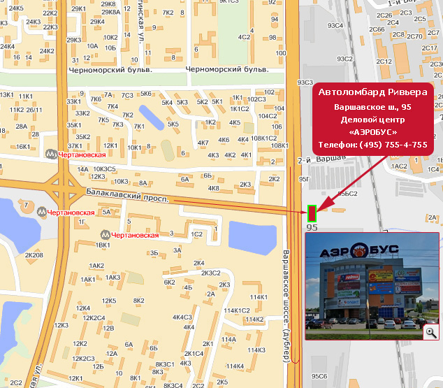 Автоломбард Ривьера. Адрес: г. Москва, Варшавское ш., д.95, к. 1 (ЮАО) , ТОЦ "АЭРОБУС", офис 449. Схема проезда